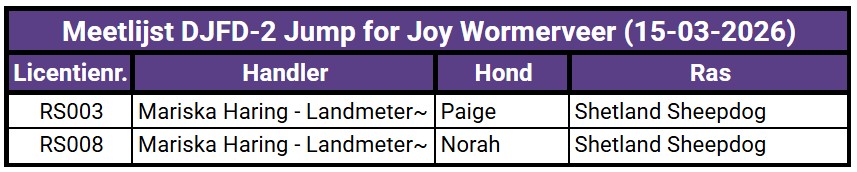 Meetlijst: | Alle small honden die nog niet eerder gemeten zijn bij DJFD worden gecontroleerd of ze in de goede hoogteklasse ingeschreven zijn. Is je hond al eerder gemeten bij de Raad van Beheer (indien small gemeten) en/of de FHN, neem dan eenmalig je werkboekje en/of meetcertificaat mee. Wij gaan dan niet opnieuw meten maar markeren de hond als definitief small bij DJFD. Wij gaan meten met behulp van een meetboog. Wij meten alleen de op het oog twijfelgevallen door het boogje er overheen te zetten. Is een hond overduidelijk small, zetten wij het boogje ernaast. Zo hopen wij de stress voor de honden zo minimaal mogelijk te houden. |
